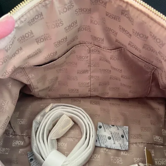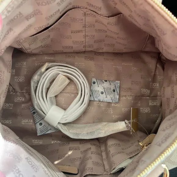 With its roomy but petite silhouette, the Grayson Duffel Satchel by Michael Kors is a staple that elevates everyday style. 4-3/4" top handles; 22-1/2" adjustable strap. Gold-tone exterior hardware. Interior back zip pocket & front slip pocket. Tablet compatible (std. size 8"-10"). PVC, polyester; lining: polyester; trim: polyurethane, cotton, polyester.
